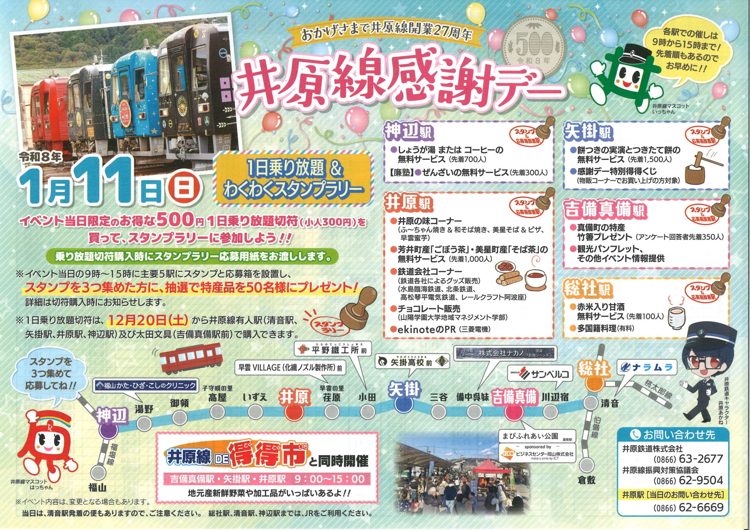 開業27周年記念「井原線感謝デー」の開催について 公開日:2025/12/12|最終更新日:2025/12/12 井原鉄道株式会社 井原鉄道では開業27周年を記念して、「井原線感謝デー」を2026年1月11日(日)に開催します。当日は大人500円、小人300円で1日乗り放題となり、沿線の主要駅前では様々なイベントが開催されます。ぜひこの機会に井原線沿線を訪れてみませんか。 井原鉄道感謝デーHPはこちら 前 “臨時列車~カシオペアクリスマス~”を運行します! お知らせの一覧へ
