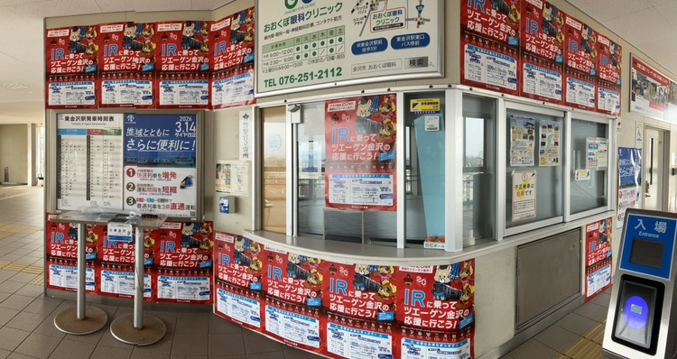 令和6年2月、当社線全線開業とほぼ同時期にJリーグ傘下ツエーゲン金沢のホームとして「金沢ゴーゴーカレースタジアム」が開場しました。当社線東金沢駅から徒歩15分です。アウェーでの応援に駆け付ける他県の方はもちろん、車利用の多い地元の方にも「飲んでも大丈夫ですよ〜。」などと鉄道利用での観戦をアピールしています。東金沢駅をチームカラーである真っ赤なポスターで染めてホームチームを応援しています。